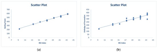 Following a seminal work by Gutman et al. [39], in order to assess the efficiency of a topological descriptor, we choose two basic physicochemical properties known as the standard enthalpy of formation and the normal boiling point . For the chemistry of the underlying chemical compounds, the enthalpy of formation exhibits the behavior of thermal properties, and the boiling point is supposed to constitute intermolecular and van der Waals interactions. The criterion to determine the performance of an irregularity index is simply the determination of the statistical correlation coefficient. The higher the value of the correlation coefficient is (i.e., closer to zero), the better the efficiency of the irregularity index.