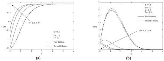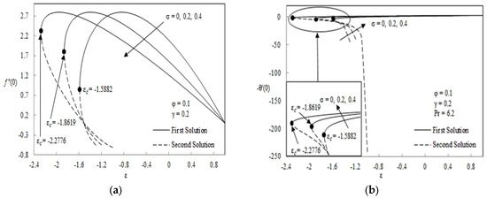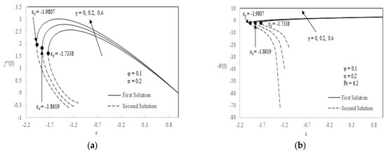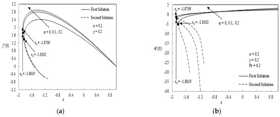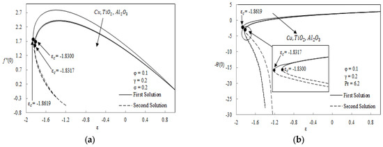 The existence of dual solutions led us to carry out a stability analysis to verify which solution is a stable solution and hence can be realized physically. The system of linear eigenvalue problems (19) and (20), along with a new boundary condition (21), was applied into the code (bvp4c) in order to get the smallest eigenvalues . The values of can be seen in Table 2, for which is approaching zero when the value of is nearer to the critical point . A positive value of corresponds to the first solution whereas a negative value of corresponds to the second solution. A negative value of indicates that there is initial growth of disturbance in the boundary layer separation and hence the solution is not stable and cannot be realized physically. On the contrary, a positive value of is expressed where there only a slight disturbance in the flow that does not interrupt the boundary layer separation, thus the first solution is stated as a stable solution and is physically realizable.