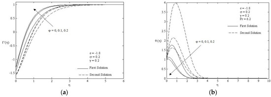 The skin friction coefficient and heat transfer coefficient for some values of slip parameter , curvature parameter , different nanoparticles as well as nanoparticle volume fraction are shown graphically in Figure 2, Figure 3, Figure 4 and Figure 5. As for slip and curvature parameters, the range taken is between 0 and 0.4 while for nanoparticle volume fraction the range is 0 to 0.2. Basically, the range of the parameters were selected by following the previous research. The results reported that only single solution is found when is greater than −1 while dual solutions is obtained when cylinder is shrunken up to critical point and no solutions exist beyond the critical point . The figures indicate that the skin friction coefficient and heat transfer rate at the surface increased with an increment of slip and curvature parameter. However obvious observation can be seen where heat transfer rate is decreasing rapidly when the cylinder is shrunk because the boundary layer becomes thick as the rate of shrinking is increased. The presences of slip and curvature parameter cause the region of dual solution to expand. Physically, the increment of the slip parameter helps to reduce the contact area of the cylinder with the fluid and hence improves the velocity and temperature boundary layer thickness. Apart from that, the increment of curvature parameter leads to enlargement of the radius of the cylinder and therefore reduces the contact area between boundary layer and fluid. So, it enhances the velocity and temperature boundary layer thickness as well. The proof of dual nature solutions in Figure 2 is displayed in Figure 6 where we depict the dual velocity and temperature profiles for various value of slip parameter. All profiles satisfy the initial and far field condition (9) at once stating that the obtained numerical results are correct. Momentum and thermal boundary layer thickness for the second solution (dash line) is always thicker than the first solution (solid line).
