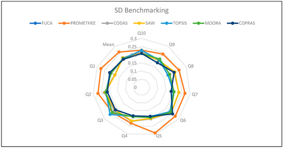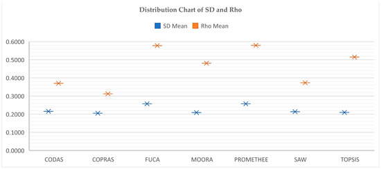 Among the MCDM methods (as in this study), if there are methods such as PROMETHEE or FUCA that give good results stably and those that perform at a lower level such as COPRAS, the comparison results become more pronounced. In the constraints of this study, methods such as TOPSIS, SAW, CODAS, and MOORA with average performance in the gray area produced results close to each other. But SD and Rho findings may not overlap. So in a comparison scenario with only these methods, the results would be confusing (without PROMETHEE, FUCA, or COPRAS). We suggest that very good and very poor performing MCDM methods should be included in the procedure and this is essential for clarifying results. Finally, there are more than 100 MCDM methods, among which there are more talented and successful ones. We suggest the authors explore them in terms of SD and Rho.