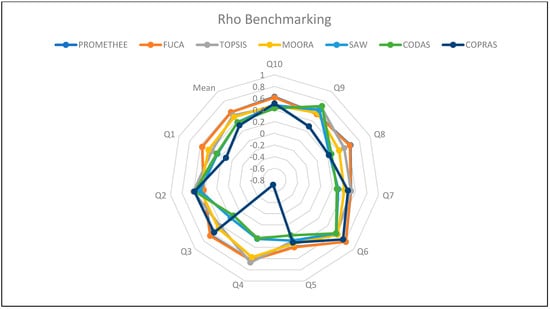 Table 14. MCDM Comparison Results by Spearman Rho Coefficient between FP and SR in 10-Quarters (2019–2021). - With these benchmarks, it is hard to claim which of the methods is the absolute better fit. But the findings from the study do contain some interesting and valuable indications of tendencies, patterns or capacities regarding SD and rho criteria. It is worth emphasizing that this study is not about methodological “inputs” but rather the “outputs”, which are the final results of MCDM methods. With the decision analytics approach, objective and consistent information about the performance of the result scores of MCDM methods was discovered through the historical data of the companies. For example, although the PROMETHEE II method is a sophisticated method, the information that it provides is the same ranking result as the FUCA method, which is one of the simplest methods. Understanding this with methodological formulas is a relatively difficult task, and no previous study in the literature was able to identify this finding.
