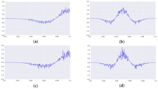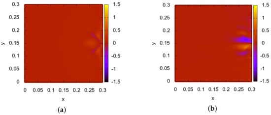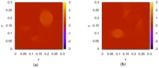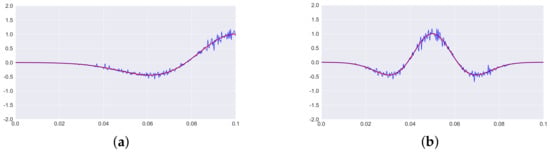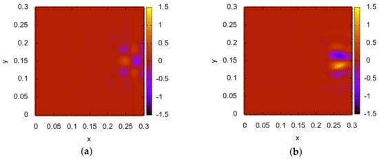 We apply the MUSCL–Hancock method for the direct and adjoint problem solution. This method was introduced in [] as a variant of the MUSCL scheme. This scheme is full time and space second-order accurate. It differs from the other MUSCL variants [,,,] in its second-order time accuracy. Indeed, the time accuracy rises when using a step based on a central-differencing scheme [,]. The -stability of the MUSCL–Hancock scheme is considered in []. The influence of the method of solving the direct and adjoint problem on the solution of the inverse problem was investigated in []. The accuracy of the numerical simulation of nonlinear acoustic wave propagation in a liquid medium based on the Navier–Stokes equations is investigated in [].