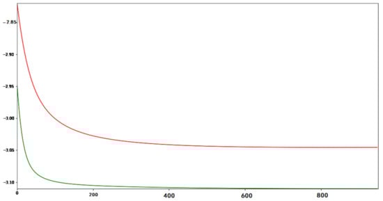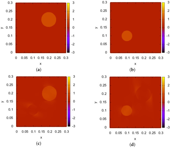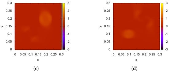 Figure 3 presents the exact solution and approximate solution of the inverse problem functions and after 1500 iterations. Figure 4 presents the exact solution and approximate solution of the inverse problem with noise in data and , respectively. The inverse problem is quite stable, even for noisy data, due to the following consideration: We recover two functions of two spatial variables, and , from the known inverse problem data of a function of three variables (two spatial variables and one time variable) .