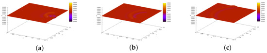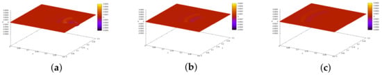 Test 2. Inverse problem 2. Additional information (function ). (a)—pressure distribution at ms, (b)—pressure distribution at ms, (c)—pressure distribution at ms.