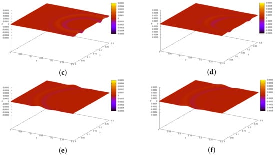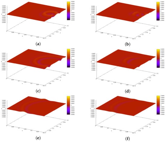 Test 2. Inverse problem 2. Numerical solution. 900 iterations. (a)—direct problem solution (1)–(5) with . Pressure ms). (b)—direct problem solution (1)–(5) with approximate solution , . Pressure ms). (c)—direct problem solution (1)–(5) with . Pressure ms). (d)—direct problem solution (1)–(5) with approximate solution , . Pressure ms). (e)—direct problem solution (1)–(5) with . Pressure ms). (f)—Direct problem solution (1)–(5) with approximate solution , . Pressure ms).
