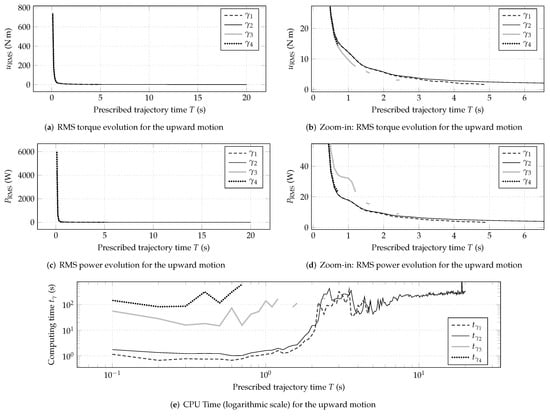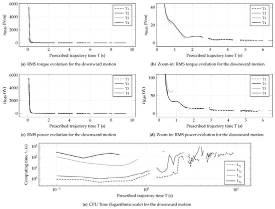 According to Figure 2a, which shows the evolution of RMS torques for the upward motion, lowest torque consumption is achieved with followed by . However, according to Figure 2c, which shows the evolution of RMS power for the upward motion, the lowest power consumption is achieved with followed by . The same observations can be made for the downward motion (see Figure 3).