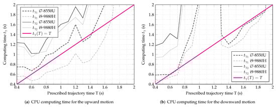 According to these results, our formulation enables a considerable CPU time decrease. In particular, let us take the computing times required by our two processors to solve our optimal control exercise using and , restrict the prescribed trajectory time window between and 2 , and plot such values. Figure 4 shows these curves for both the upward and the downward motion. Note that the values that remain below the solid straight line correspond to CPU computing times for which . Optimal trajectories for which this is the case take less time to compute than the time T they require to complete. In other words, for some of these prescribed time T values, not only could real-time optimal control eventually be considered but also motion replanning.