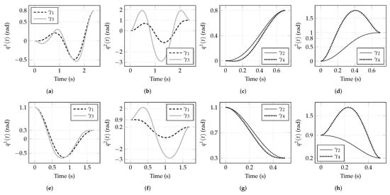 Comparison of positions along optimal trajectories, resulting from invariant running cost functions ( and ) versus non-invariant ones ( and ). Functions and share a torque criterion; functions and share a torque plus velocity criterion. The invariant running cost functions stabilize motion by narrowing angular amplitude. (a) Joint 1 positions with and for the upward motion. (b) Joint 2 positions with and for the upward motion. (c) Joint 1 positions with and for the upward motion. (d) Joint 2 positions with and for the upward motion. (e) Joint 1 positions with and for the downward motion. (f) Joint 2 positions with and for the downward motion. (g) Joint 1 positions with and for the downward motion. (h) Joint 2 positions with and for the downward motion.