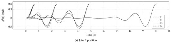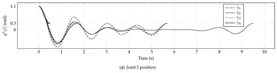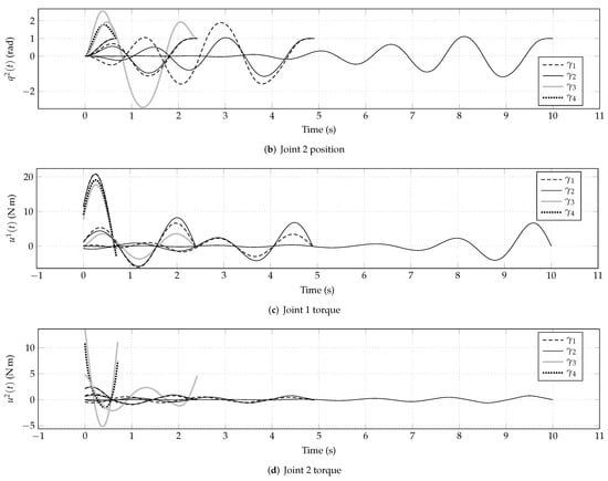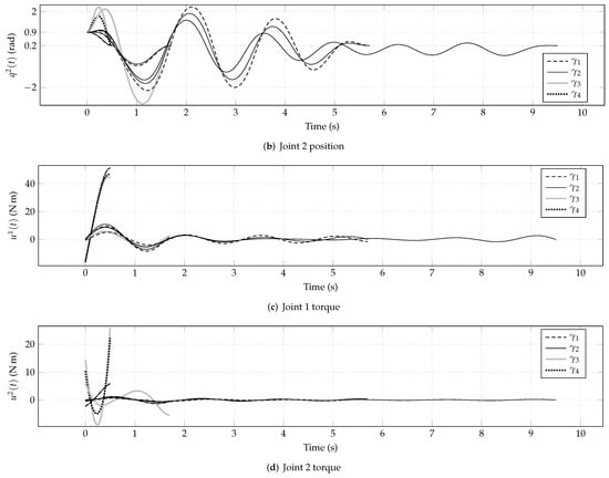Numerical solution of the optimal control for a downward motion (see Step 1 of Section 6.1.3). Optimal torque and position evolution along four simulated trajectories: T = , T = , T = , and T = . Trajectory durations correspond to values of T in Table 1, which are the maximum values at which NDSolve successfully determined a solution. Higher values of T and narrower motions are achieved with the invariants and .