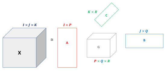 The Tucker3 [18] decomposition decomposes a three-way array X of order into , , and component matrices , , and and a weight array , being the complexity of the model (see Figure 1).