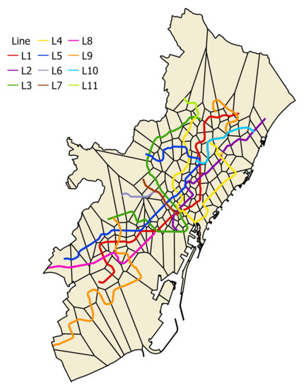 The metro smart card data were collected from the automatic fare collection (AFC) system. The data used correspond to the number of entries in each station from 5 March 2018 to 11 March 2018. This week was chosen because it did not include any public holiday, nor were there extreme weather conditions, so it would reflect the passenger flow under normal conditions. In this work, 11 lines and 129 stations are analyzed (see Figure 2).