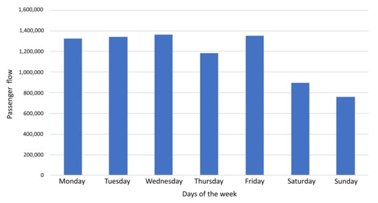 Figure 3 shows the daily metro passenger flow for the week under study. It can be seen how passenger flow varies between days of the week, being significantly higher on workdays than on weekends, which indicates that a high amount of passengers are commuters.