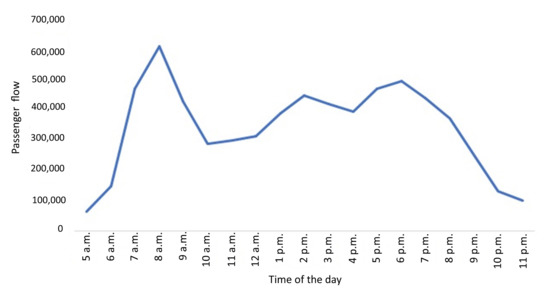 In addition, the volume of passengers fluctuates depending on the time of day. The average number of passengers per hour is 8,212,415 with a standard deviation of 166,811.51. Figure 4 shows the total number of passengers per hour on workdays.