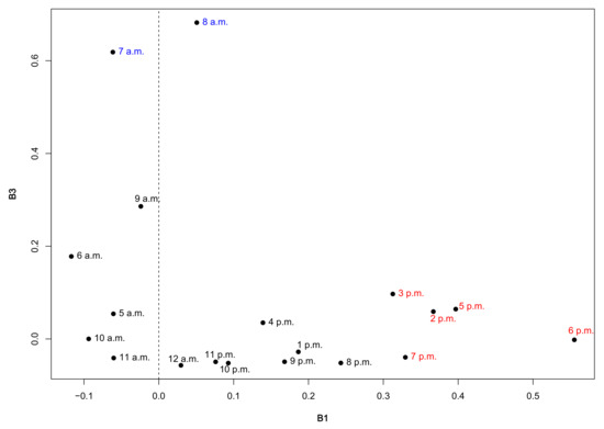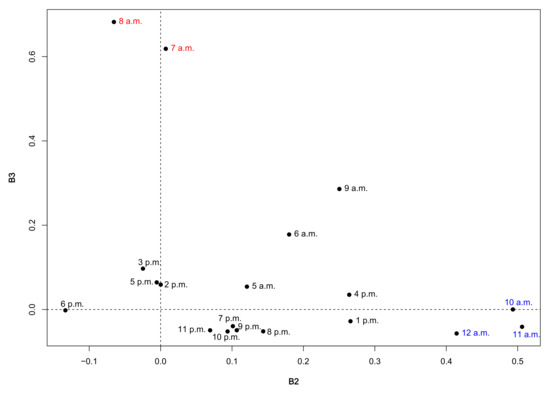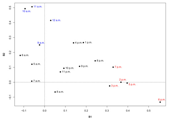 As previously noted, the time information is described in terms of the different loadings for each hour on the three components of the second mode (Figure 7, Figure 8 and Figure 9). In Table 3, it can be seen that Component 1 for the timetable mainly depends on 14:00, 15:00, 17:00, 18:00, 19:00, and 20:00. Hence, this component can be associated with afternoon and evening peak hours. Component 2 is strongly related to 10:00, 11:00, and 12:00, and so this component could be defined as off-peak hours. Finally, Component 3 has high values on 7:00 and 8:00 so it could be interpreted as morning rush hour. Some hours present high loads in more than one component, e.g., 9:00, with high loads on the second and third components.