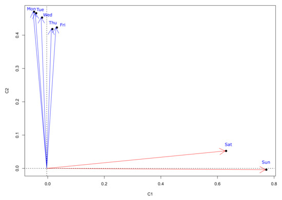 When inspecting the day component matrix (see Table 4 and Figure 10), it can be noted that the first component refers to weekend days and the second component clearly refers to weekdays, as Saturday and Sunday load high on the first component and the rest of the days on the second one.