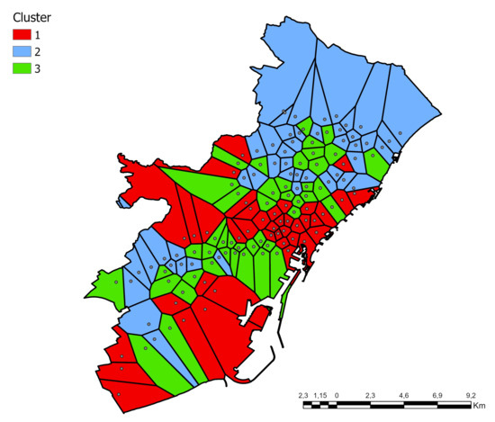Cluster 1 includes, amongst others, stations located in the industrial and logistics zones of the city (Fira, Mas Blau, MercaBarna, and Parc Logístic), hospitals ( Hospital Clínic, Hospital de Bellvitge, and Vall D’Hebron), and those belonging to the University campus (Zona Univesitá, Marina, Universitat, Ciutadella, and Diagonal). In addtion, stations close to hotels and landmarks are included, such as Sagrada Família, El Born, Barceloneta, Plaza Catalunya, Passeig de Gràcia, Jardines de Pedralbes, Barrio de Gràcia, Les Rambles, and Palau de la Música, among others. The two stations in Barcelona’s airport also belong to this group. Stations in cluster 2 are mainly located in the municipalities of Badalona, San Adriá de Besós, Hospitalet de LLobregat, Esplugas de LLobregat, El Prat de LLobregat, Cornellá de LLobregat, Moncada y Reixach, Santa Coloma de Gramanet, and some surrounding neighbourhoods such as Nou Barris and Sant Andreu. Finally, stations in cluster 3 are locate around the city center of Barcelona, mainly in Sant Andreu y Horta Guinardó.