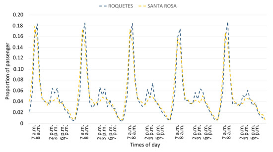 The core matrix indicates that the combination of components that extracts the largest variability is the combination of the first component of the first mode, the third component of the second mode, and the second component of the third mode, (Table 5). It indicates positive interaction among components P1, Q3, and R2. This reveals that stations with high loadings on the first component have an increase in the proportion of passengers when associated with the morning peak hours (7 a.m., 8 a.m.) on weekdays. This is the case of stations belonging to the Cluster 2 like Roquetes or Santa Rosa, amongst others. The passenger’s pattern of proportion per hour for Roquetes and Santa Rosa stations, both belonging to Cluster 2, is shown in Figure 12. In that figure, the highest passenger flow taking place between 7 and 8 in the morning is shown. In contrast, stations with negative values on the first component have a decrease in the proportion of passengers in the rush hours in the morning (Figure 13).