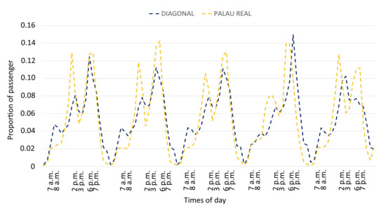 The core element among components P2, Q1, and R1 highlights that stations with high loading in the second component have a larger proportion of passengers in the afternoon and evening rush hours on weekdays. This is the case of stations in Cluster 1. In Figure 13, the pattern of proportion of passengers per hour is shown for Diagonal and Palau Real stations. According to the figure, the highest passenger flow takes place between 2 and 3 in the afternoon and 5 and 8 in the evening. It can also be seen how the stations in cluster 2 (with negative scores on the second component) have a lower proportion of passenger at peak hours in the afternoon and evening on weekdays (Figure 12).