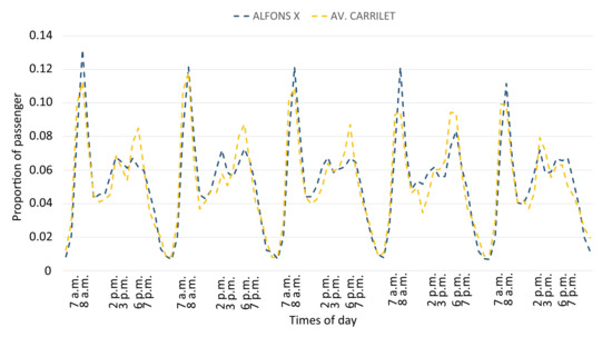 In contrast, as previously seen, there are stations with high loadings on both dimensions. Thus, in these stations there are peak hours both in the morning and in the afternoon on weekdays. Some stations in this group are Alfons X, Av.Carrilet, Clot, Bellvitge, Collblanc, Encants, Fabra i Puig, Hospital de Sant Pau, Joanic, and Poblenou. Figure 14 shows the pattern of proportion of passengers per hour for some stations in this group.