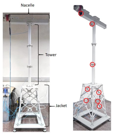 Components of the scale offshore jacket-type support laboratory model (left); sensor location on the wind turbine down-scaled model (right).