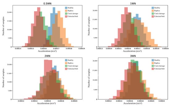 Histograms for each structural state (blue stands for the healthy state, orange for the replica bar, green represents the crack damage, and pink is related to the unlocked bolt state) and for each different white noise (WN) amplitude factor.