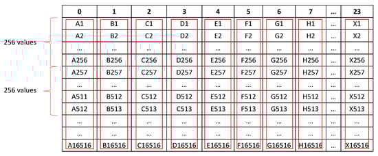Selection of 256 sequential values for each row.