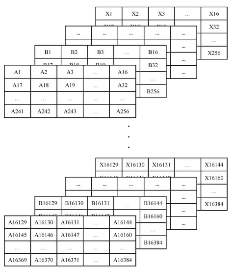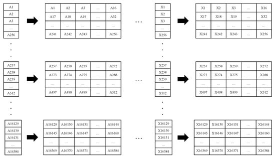 The last 132 values from each column were not considered because they could not complete the 256 values required to build a (16 × 16) matrix. Once the two-dimensional matrices were obtained, the process was continued with the creation of the 16 × 16 × 24 size images. For each experiment, the first matrices formed by the 256 first values of their respective columns were time-related. Meaning that each value from a specific position on each matrix was sampled at the same time as the values occupying the same position on the rest of the 23 matrices. Basically, the first 24 matrices were grouped together to maintain this relation provided by this new feature. The same was applied to the second group of matrices, and so on and so forth, until 64 groups of matrices were obtained from each experiment (see Figure 7).