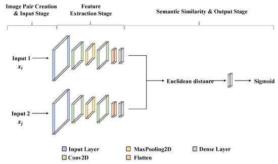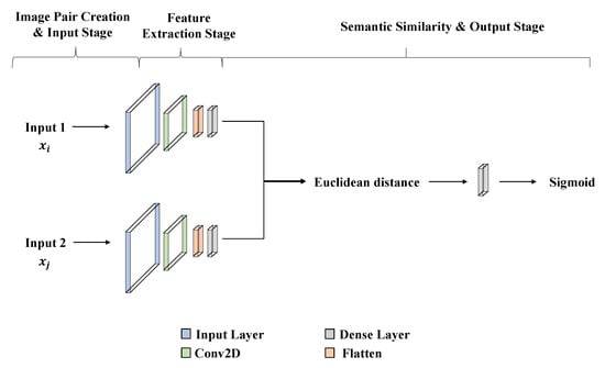 In this work, the two neural networks are both convolutional neural networks [22] and employ back-propagation during training [23]. The basic idea of this methodology is that both networks work in parallel and finally compare their outputs. The comparison function is the Euclidean distance. The output generated by an SNN execution can be considered the semantic similarity between the projected representation of the two input matrices [24].