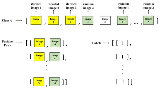 Figure 10. Positive pairs’ creation process.For the creation of negative pairs, a similar process is carried out, but the random image is chosen from class B. Then, a label with the value of 0 is added to the labels array previously created in order to maintain the index relation between the pair and the label. This iterative process is carried out also for class B (the negative image comes from class A and positive image comes from class B), so it can be ensured that all the images are used. This process can be observed in Figure 11.