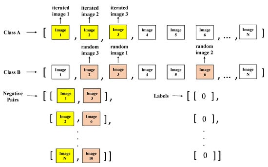 - Image pair creation Stage: The SNN has a pair of images input, where this pair can be positive or negative. A positive pair consists of two images that belong to the same class, while a negative pair consists of two images from different classes [25]. For the training, validation, and test sets, positive and negative pairs were created. For explanation, the two classes are noted as class A and class B. First, an empty array for the pair of images is set as well as an empty array of labels, which help to indicate by index if a pair of images (from the pair of images array) is positive (1) or negative (0). Next, an iterative process is performed through the set of images that belong to class A. For each image, a random image is selected from the same class. Next, a positive pair is created by the image that is being iterated, and the random image selected from the same class (this pair is added to the image pair array). Then, a label with the value of one is added to the labels array previously created, so the image pair added, and the label are related by position through both of the arrays. This process can be observed in Figure 10.