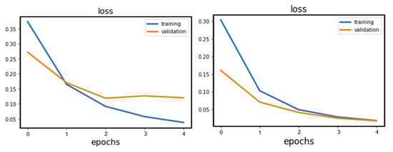 To recognize whether a model is overfitting, the loss curves of the training set and the validation set are first presented. Overfitting implies that the model is too closely aligned with a limited set of data points (training data) [28], thus reducing its predictive power. In Figure 12 (left), it can be observed that, for the damage detection stage, model 1 is overfitting (from epoch 2, the validation loss starts to increase while the training loss continues to decrease). On the other hand, Figure 12 (right) shows that model 2 has an appropriate fitting.