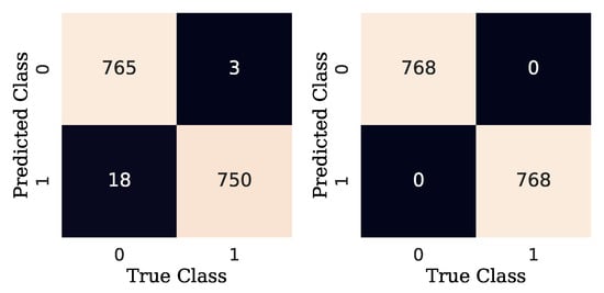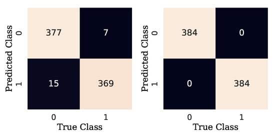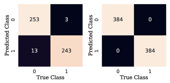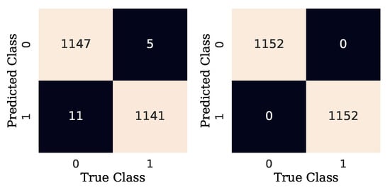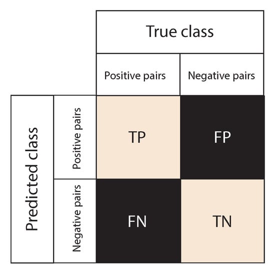 Additionally, to measure the performance of detection and diagnostic models, the results of a confusion matrix can be used to determine the accuracy, precision, recall, and F1 score of the predictions made on the test data set [29]. As can be seen in Figure 14, a confusion matrix is an array that shows the predictions of the true positives (TP), true negatives (TN), false positives (FP), and false negatives (FN) made by a classification model [30]. Note that, in this work, the output of the model is a probability of similarity between two images. In other words, the algorithm states whether the two samples are similar (labeled as 0) or not (labeled as 1). For the binary problem at hand, a TP occurs when both samples in the pair (images) are similar (positive pair), and the algorithm predicts accordingly. A TN occurs when both images in the pair are not similar (negative pair) and the algorithm predicts correctly. An FP results when the samples are similar, but the algorithm predicts that they are not similar. Finally, an FN occurs when both samples are not similar, but the algorithm predicts the opposite. The aforementioned metrics can be obtained from Equations (4)–(7).