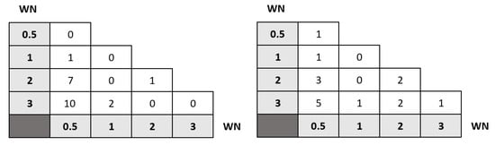 A follow-up was conducted on the performance of model 1, according to the different levels of WN amplitude factors (0.5, 1, 2, 3) for the initial 80%, 10%, and 10% data split. The purpose was to find how many failed predictions are made for each of the different WN amplitudes. Figure 19 (left) shows the results for the damage detection stage. Specifically, it can be seen that, for the case of WN with amplitude factor 0.5, there are no wrong predictions. Similarly, for the WN amplitude factor 1, there is only one incorrect prediction that is at least identified as belonging to amplitude 1. In the case of WN amplitude factor 2, there are seven incorrect predictions that are assigned as similar to amplitude factor 0.5. Finally, for WN with factor 3, there are 10 incorrect predictions that map to WN with factor 0.5, and two incorrect predictions where the model assimilates them to samples in WN factor 1. Figure 19 (right) shows similar results but for the damage diagnosis stage. These results can be summarized in the following manner. When an image comes from a WT operating at higher wind speeds (simulated in the experimental tower with a higher white noise amplitude factor), the model has far more failed predictions, which is in good agreement with the insight obtained in the exploratory data analysis performed in Section 3.2.