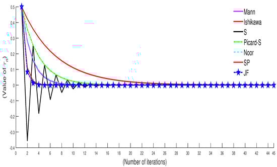Now, we extend the following example to compare the rate of convergence of the JF iterative algorithm to some other well-known iterative algorithms for operators that satisfy condition .