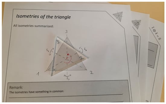 - Key Notion 1: In the first unit, the students explore the dihedral group of the equilateral triangle and get in touch with the basic notions of group theory, such as inverses, the identity element, and commutativity. They do so by working with a plexiglass triangle, so the isometries can be experienced in a haptic way (Figure 1). The isometries are described from a geometrical point of view (i.e., rotation by or reflecting on the bisecting line through vertex 1), resulting in .