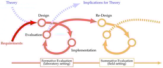 - Sequential cycles of design, evaluation and re-design: DBR is characterized by an iterative process. DBR projects consist of sequential cycles of design, implementation, and evaluation followed by re-design cycles which are based on the evaluation results of the previous cycle [], as shown in Figure 2.