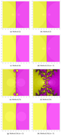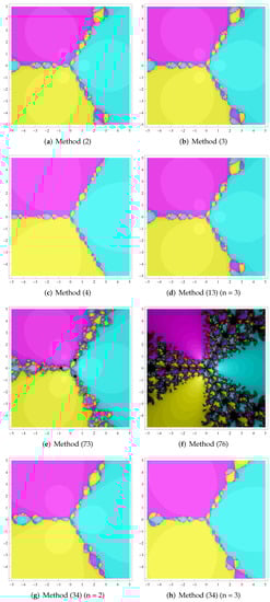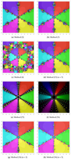 The basins of attraction can be applied to analyze the stability of the multipoint iterative method [,,,,,,,,,], which will help us to select the iterative schemes whose behaviors are better qualitatively. Figure 1, Figure 2, Figure 3, Figure 4 and Figure 5 show the basins of attraction of different methods. Our methods (13) (n = 3) and (34) (n = 2,3) are compared with methods (2) (n = 3), (3) (n = 3), (4) (n = 3), (73) and (76) for solving complex equations . The field is divided into a grid of in Figure 1, Figure 2, Figure 3, Figure 4 and Figure 5. The initial point will be painted with black after 25 iterations. If the sequence generated by the iterative method reaches a zero of the polynomial, the initial point will be painted in a color previously selected for this zero. In the same basin of attraction, the number of iterations needed to achieve the solution is shown in darker or brighter colors (the less iterations, the brighter the color). The tolerance is in programs. Table 1, Table 2, Table 3, Table 4 and Table 5 show the average number of iterations(ANI) and the percentage of points (POP) which guarantee the convergence to the roots of complex equations .