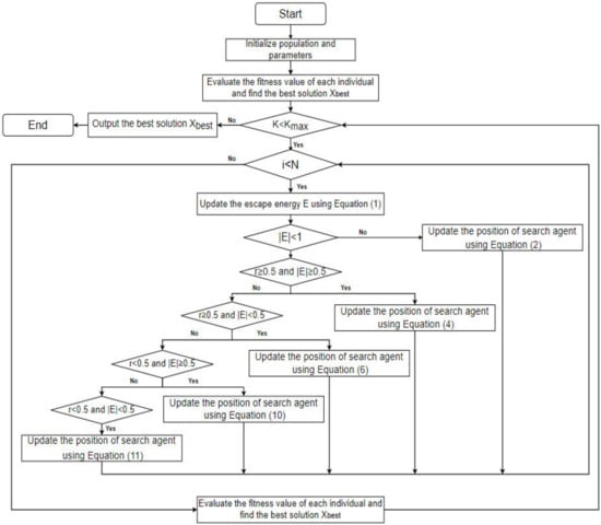 The pseudo-code containing all the steps of standard HHO algorithm is shown in Algorithm 1 and the flow of search process is presented in Figure 1.