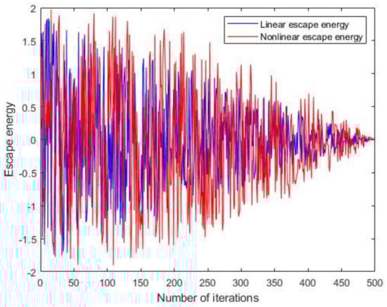 The escape energy in the HHO algorithm is a linear function. In the earliest stages, the algorithm belongs to exploration phase. In the middle and later stages, the algorithm belongs to the exploitation phase. However, HHO has the lower diversity and is easy to fall into the local optimum. Therefore, we further improve the escape energy, and propose a nonlinear escape energy as shown in Equation (14):