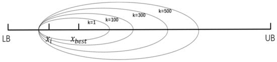 where indicates a random number from the interval (−1, 1), represents the current iteration number, and represents the maximum iteration number.