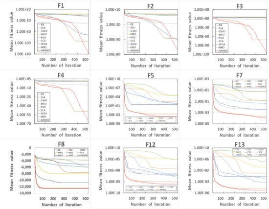 Figure 6 shows the convergence curves of ARHHO and its comparison algorithm in some of the benchmark problems with 30-dimensional. It can be learned that ARHHO can converge to the optimal value at the fastest speed for both types of functions. Moreover, the accuracy of ARHHO is better than other comparison algorithms, except that accuracy of SSA is significantly better than ARHHO in F6 function. In particular, the convergence curves of F1, F2, F3, F4, F5, F7, F8, F12, and F13 present an outstanding optimized performance with rapid convergence and better accuracy.