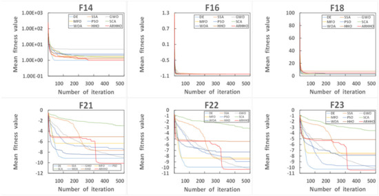 Figure 7 reflects the convergence of ARHHO and its comparison algorithm in fixed-dimensional functions. Compared with other algorithms, the convergence of the ARHHO algorithm is faster in the F21, F22, and F23 functions, and is similar in the F14 to F18 functions, and is slower in the 19 and F20 functions. From the perspective of convergence accuracy, the ARHHO performs better than other algorithms on functions F14, F15, F21, F22, and F23, and worse on functions F18, F19. Moreover, ARHHO shares convergence accuracy with at least one algorithm from the algorithms compared in function F16 and F17. The adaptive relative reflection strategy plays a key role in helping ARHHO to jump out of the local optimum and achieve satisfactory accuracy.