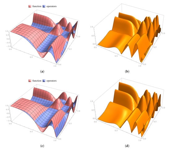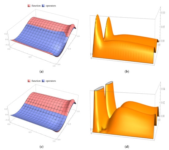 Approximation and error of approximation of operators when both shape parameters and change. (a) Approximation: . (b) Error of approximation: . (c) Approximation: . (d) Error of approximation: .
