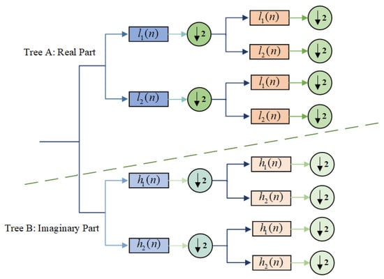 Due to the unique physical structure of real DWT, DWT has multi-resolution properties, but it still suffers from disadvantages, such as insufficient translation sensitivity and direction selectivity. To solve these disadvantages of the DWT, Kingsbury et al. [23,24] proposed DTCWT. DTCWT uses a two-way DWT structure of a binary tree, where one tree corresponds to the real part of the DWT, and the other tree corresponds to the imaginary part of the DWT. DTCWT uses a low-pass filter and a high-pass filter bank, the real part and the imaginary part are respectively subjected to multi-scale sub-band decomposition at the same time, and then, multi-scale and multi-directional sub-band coefficients are obtained.