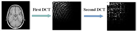 The frequency coefficient distribution of the image after the DCT is shown in Figure 2. The DCT transforms the image data into the frequency domain, which is divided into direct current coefficient (DC) and alternating current coefficient (AC). The DC coefficient represents the mean value of the brightness of the image. A large part of the image information focuses on the upper left corner. Therefore, DCT has a strong ability to concentrate information, and it can better relieve the correlation between image pixels and concentrate the image energy mainly in the low-frequency coefficients of the DCT spectrum, so it is broadly applied in the image compression field [27,28].