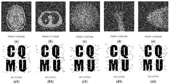 Attacked medical images and restored watermarking images under Gaussian noise 30%: (a,a1) brain and extracted watermarking image; (b,b1) chest and extracted watermarking image; (c,c1) fundus blood vessels and extracted watermarking image; (d,d1) hand and extracted watermarking image; and (e,e1) breast and extracted watermarking image.