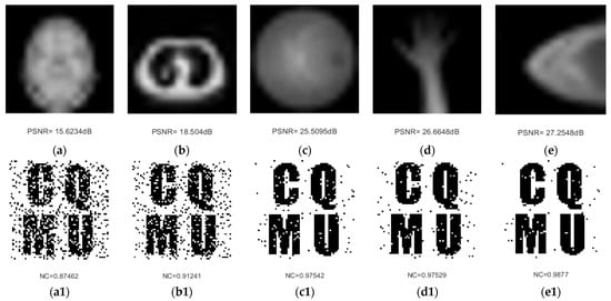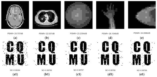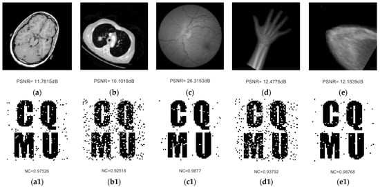 Attacked medical images and restored watermarking images under scaling factors 0.125 then factors 8: (a,a1) brain and extracted watermarking image; (b,b1) chest and extracted watermarking image; (c,c1) fundus blood vessels and extracted watermarking image; (d,d1) hand and extracted watermarking image; and (e,e1) breast and extracted watermarking image.