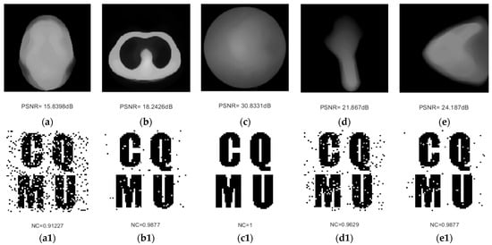 Attacked medical images and restored watermarking images under (7 × 7), 20 times median filter attacks: (a,a1) brain and extracted watermarking image; (b,b1) chest and extracted watermarking image; (c,c1) fundus blood vessels and extracted watermarking image; (d,d1) hand and extracted watermarking image; and (e,e1) breast and extracted watermarking image.