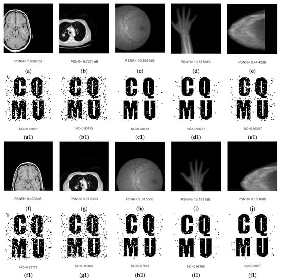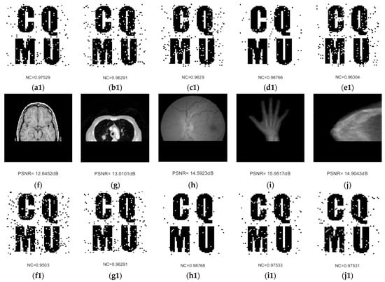 Attacked medical images and restored watermarking images under X-axis cropping 40% and Y-axis cropping 30%: (a,f,a1,f1) brain and extracted watermarking image; (b,g,b1,g1) chest and extracted watermarking image; (c,h,c1,h1) fundus blood vessels and extracted watermarking image; (d,i,d1,i1) hand and extracted watermarking image; and (e,j,e1,j1) breast and extracted watermarking image.