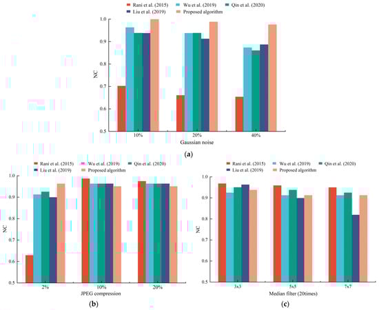 Comparison of the robustness of different algorithms under common attacks: (a) Gaussian noise; (b) JPEG compression; and (c) median filtering.
